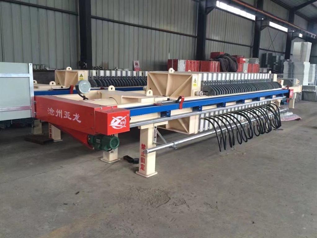 板框壓濾機(jī)主要由推力板(固定濾板)、壓縮板(移動(dòng)式濾板)、濾板和濾架、橫梁(扁鐵框)、濾料(濾布或?yàn)V紙等)、壓實(shí)裝置、液體集箱等組成。